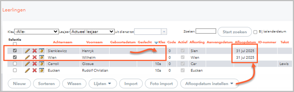 Met de knop Afloopdatum instellen onderin het venster Leerlingen kunt u snel een aantal geselecteerde leerlingen een afloopdatum geven.