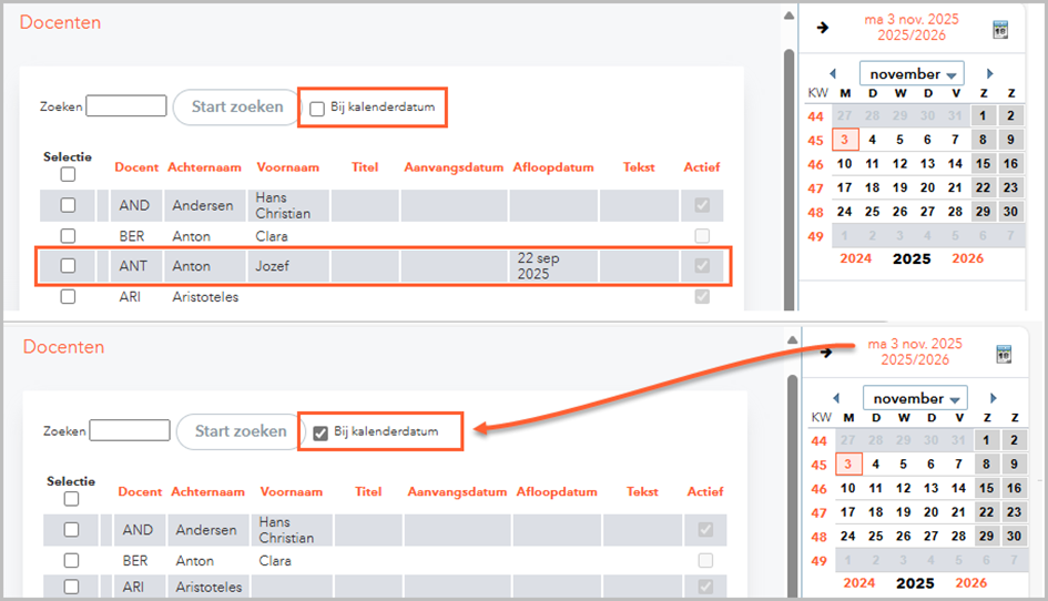 Is de optie Bij kalenderdatum aangevinkt, dan worden alleen nog de docenten getoond, die op de geselecteerde datum in de kalender actief zijn.