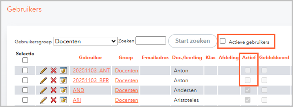 Maar u kunt deze gebruikers (niet de docent) natuurlijk ook wissen. Door sortering van de kolom Actief of Gebruiker zijn deze gebruikers snel op te sporen, te selecteren en vervolgens te wissen.